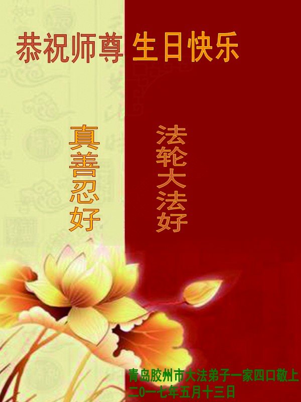 山東省青島市膠州市大法弟子一家四口恭祝師尊生日快樂!
