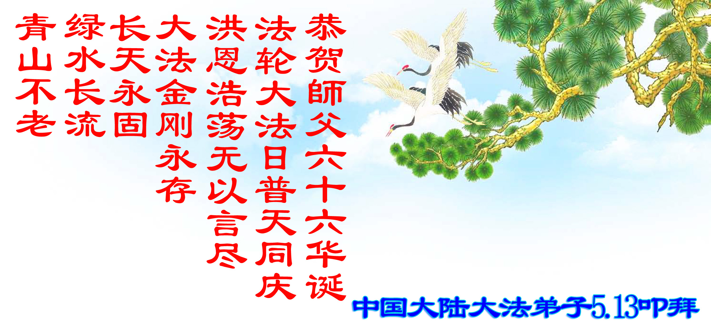 今年的法輪大法日與師父的壽誕之日到來,祝師父生日快樂!我從得到大法這麼多年也沒有同師父見一次面,我知道師父很辛苦,我所做的也未達到大法的標準。現在是到了最後時期,我一定不辜負師父的期望,一定走好師父安排的路,請師父放心。