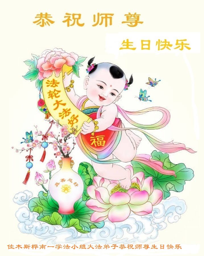 尊敬的師父您好!您辛苦了!感謝師父的慈悲救度和二十多年來的保護!一路走來感慨頗多,收穫頗多,也走了一些彎路。在此全球大法弟子共度自己的節日之際,我們會總結自己以往的經驗教訓,走好後面的修煉道路,按照師父要求做好三件事,完成自己的神聖使命。恭祝師尊節日快樂!