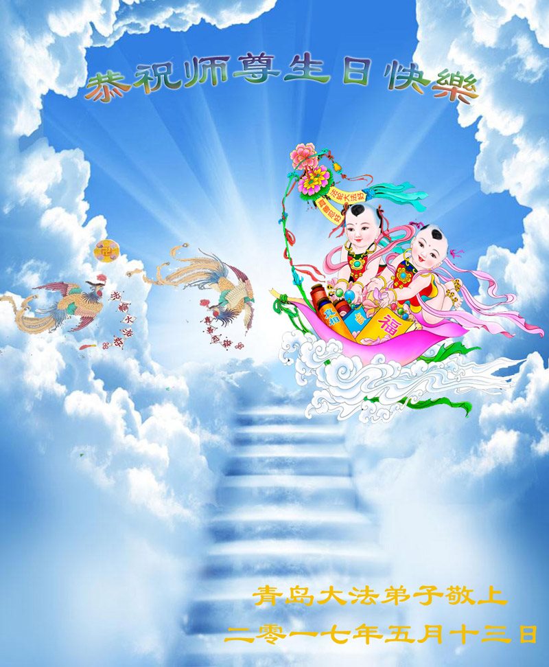 山東省青島大法弟子恭祝世界法輪大法日!祝師尊生日快樂!在這普天同慶的日子裏,青島大法弟子跪拜師尊!
