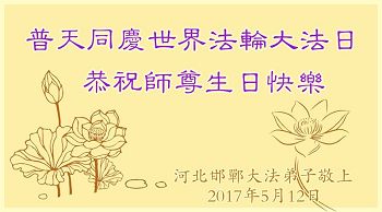 河北邯鄲大法弟子普天同慶世界法輪大法日!恭祝師尊生日快樂!