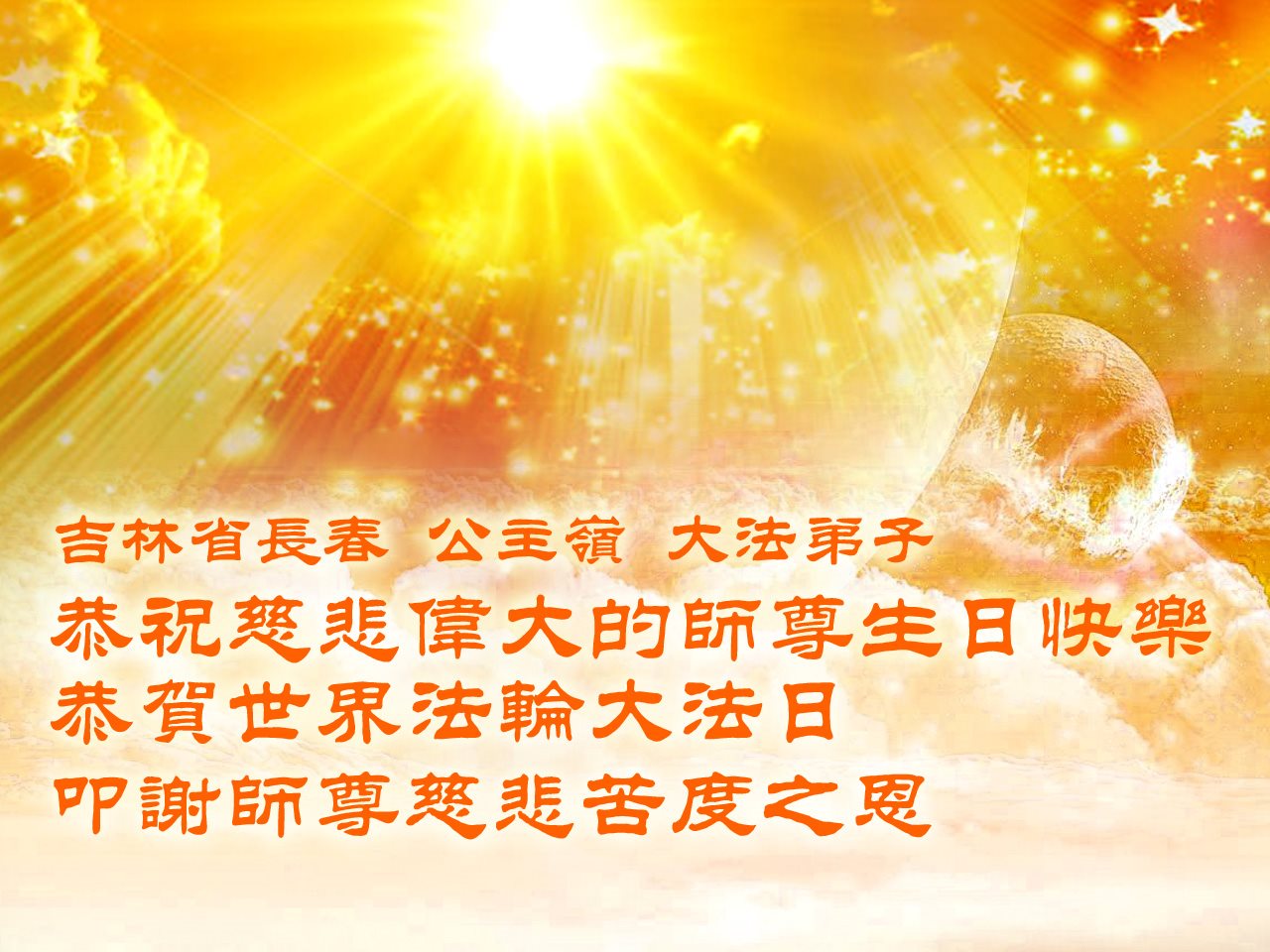 值此師父生日和世界法輪大法日之際,弟子向師父跪拜叩首恭祝慈悲偉大的恩師生日快樂!恭祝世界法輪大法日!