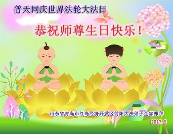 我們是青島市平度市一學法小組的大法弟子,我們跪拜師尊,恭祝師尊生日快樂!普天同慶世界法輪大法日!我們一定配合好,救度更多的眾生,以報師恩!