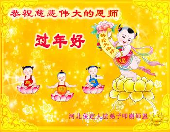 河北保定白溝鎮全體大法弟子恭祝師尊新年快樂! 在正法最後的日子裏,我們一定牢記師尊的教誨,做好三件事,跟師父回家!