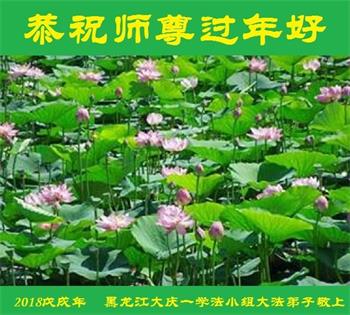 在二零一八年中國新年即將到來之際,黑龍江省大慶市創業城大法弟子恭祝慈悲偉大的師尊新年快樂!在過去的一年和即將到來的新年裏大法弟子要一如既往的謹記師尊教誨:「修煉者永遠是修自己」。修出善,修出慈悲,助師正法,祝師救眾生。惟願師尊笑。兌現與師尊的誓約。隨師返家園。