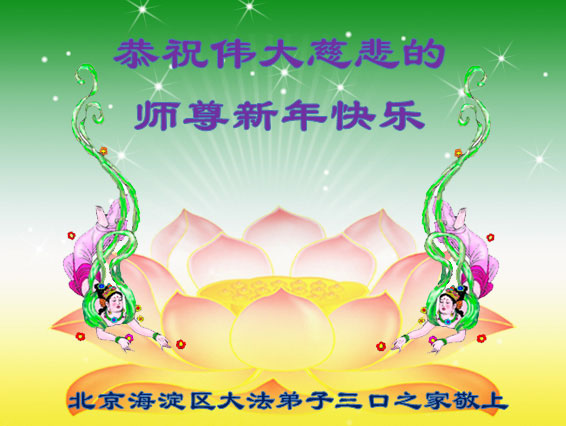 師尊新年好!您辛苦了!我們是1996年得法的大法弟子,修煉走到今天。是您把我們一家三口從地獄撈起,用大法洗滌我們的靈魂與身體,找到了返本歸真之路。是您牽著我們的手一步一步跟上了正法進程。用盡千言萬語也表達不了對您的感恩!請師尊放心我們一定聽您的話,我們一定學好法、多學法,修好自己,遇事向內找,找回修煉如初,修去所有人心與執著,兌現史前誓約,做好大法弟子必須做好的三件事,圓滿隨師還!
