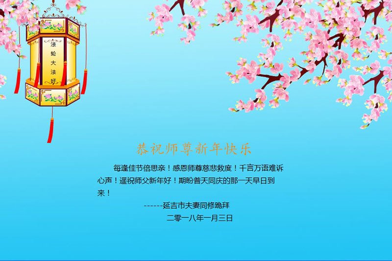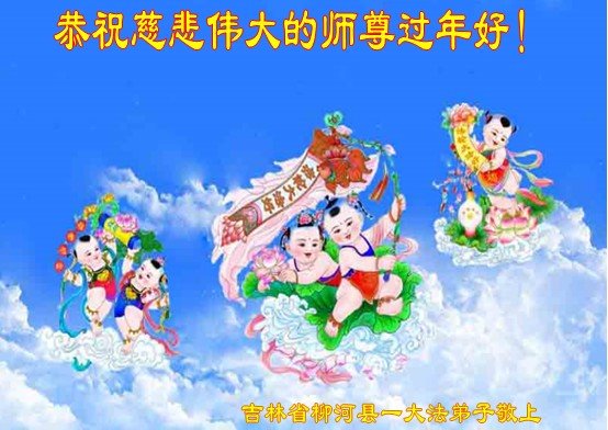 師尊過年好!師尊過年好!在新年到來之際,柳河縣全體大法弟子感恩師尊的慈悲救度!在新的一年裏,我們一定學好法,無條件的向內找,形成整體。無論外在環境如何變化,弟子們都會牢記師尊的教誨,抓緊時間多救人,不辜負師尊的期望。全體大法弟子叩拜師尊!合十!