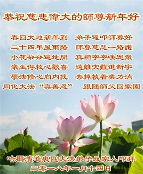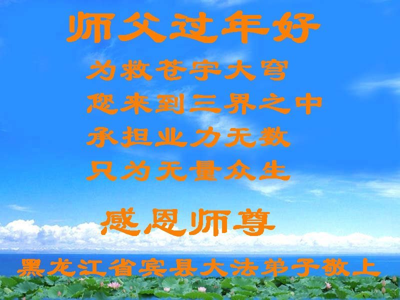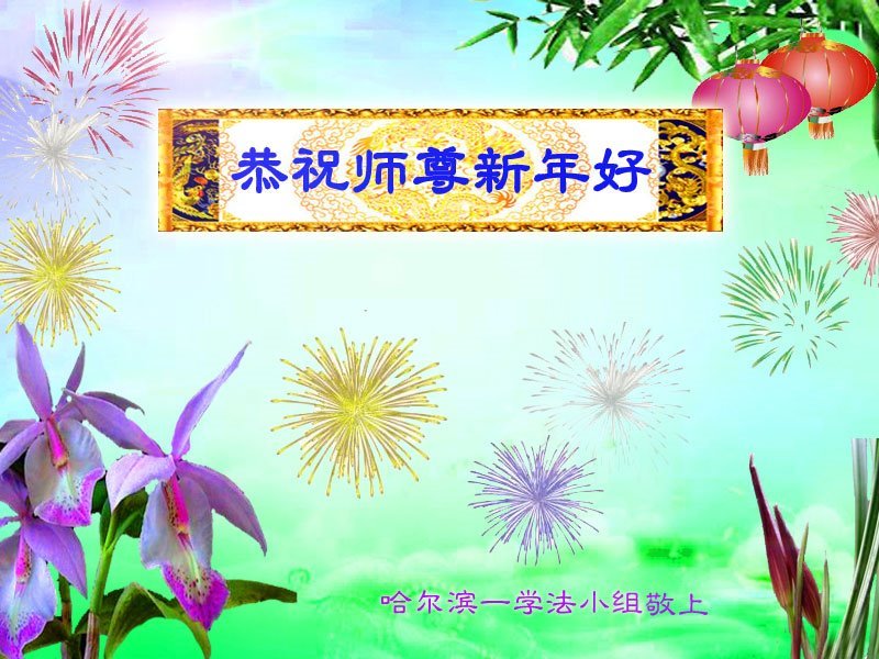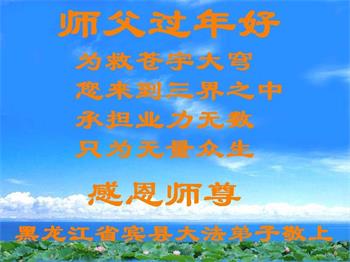 師父好!在新年到來之際,哈爾濱木蘭縣大法弟子向慈悲偉大的師尊致以真心的問候:師父新年好!師父辛苦了!在正法的最後階段,弟子們一定理智、精進的做好三件事,無論時日多長,弟子們一定緊跟正法進程,不鬆勁,修好自己,多救人,跟師父走到法正人間的那一天,兌現史前大願、神的誓約。謝謝師父!