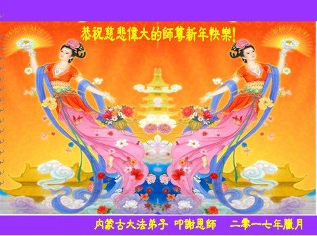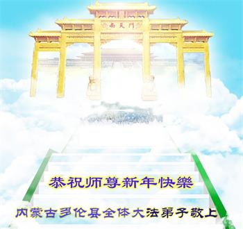 在此新年來臨之際,內蒙古錫林郭勒盟多倫縣全體大法弟子恭祝慈悲偉大的師父新年快樂!年復一年我們背負著眾生得救的希望,一路走來有艱辛,困苦,伴隨著的是喜悅和滿足。我們沐浴在法光中備受師尊的保護,走到今天。心中對師父的感恩無以言表,心中對大法的堅信堅不可摧,為了更好的完成我們史前的誓約,救度更多世人,我們一定以法為師走正師父安排的路。