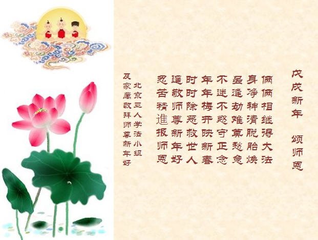 尊敬而又慈悲的師父過年好!在中國新年即將來臨之際,弟子們在北京給您拜年了,恭祝您新春愉快!請師父放心,弟子們將按照您的教誨,正法不止,精進不停。再次感恩師父的慈悲與呵護!敬拜叩首!