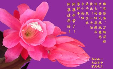 在這中國新年將來臨之際弟子感慨萬千。能成為您的弟子是多麼的光榮、多麼的幸運。是您把我們從地獄撈起又帶領我們走入未來,不僅給了我們生命的未來,又把我們推上了至高的佛位。成就了我們的一切。我僅代表我們一方的眾生叩拜偉大師尊。傾盡所有也表達不了弟子的感恩。從今天起要奮起直追,在以後的時間裏修去所有的人心,讓師父少一些操勞,多一些欣慰。