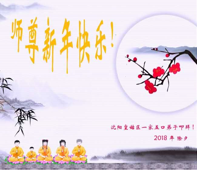 又是一年芳草綠,依然十里梅花香!戊戌年新年來臨之際,瀋陽市遼中區一學法小組二位大法弟子和身邊的幾位老年大法弟子一同恭祝師尊新年快樂!