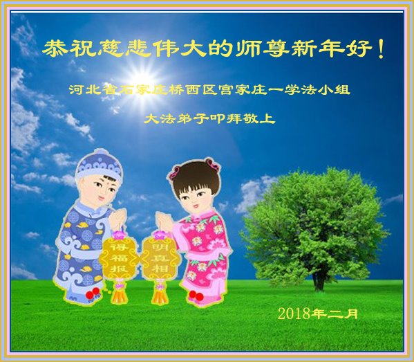 河北省石家莊橋西區宮家莊一學法小組大法弟子恭祝慈悲偉大的師尊新年好!給師尊拜年!您辛苦了,弟子們會牢記您的教誨,多學法,在修好自己的同時,做好三件事,更快更多的救人。不辜負師尊的慈悲苦度。