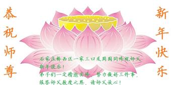 石家莊市新華區一講真相小組全體大法弟子遙祝師尊過年好!弟子們想念師父!我們一定修好自己,做好三件事,用實際行動多救人,讓師尊多一份欣慰,少一份操勞,跟師尊走到正法的最後一天。請師尊放心!