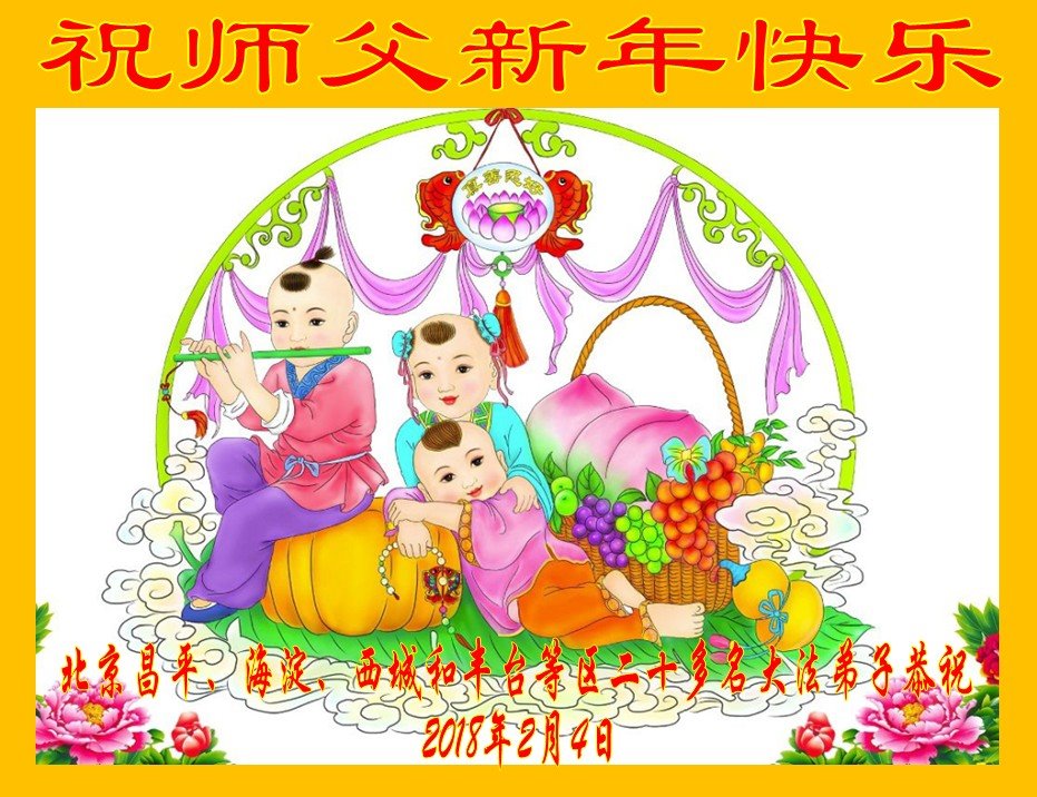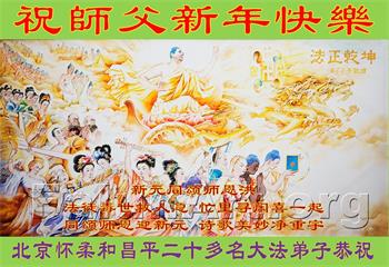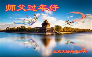 我們是北京朝陽區雙井、百子灣、甜水園、團結湖、紅廟和北京市豐台區南窯數十名大法弟子,在這辭舊迎新的喜慶時刻懷著幸福、激動、感恩的心,向我們慈悲偉大師尊拜年!師父,謝謝您!祝師尊過年好!