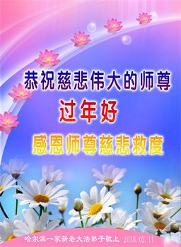 首先祝師父好!師父新年好!師父您辛苦了!一年過去了,弟子們在今後一定要做好三件事,不讓師父操心,勇猛精進。今後弟子們多同化法,多救人。感恩師尊的一路呵護,感恩師尊的慈悲救度,感恩師尊的一等再等,感恩師尊!弟子們再一次恭祝師尊新年好!