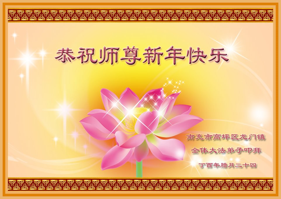 師尊過年好!又是一年新年到,師父辛苦了,弟子感恩師尊對我們的苦度。我們蓬安縣大法弟子一定不辜負師尊給予的所有。勇猛精進,做好三件事,圓滿隨師還。