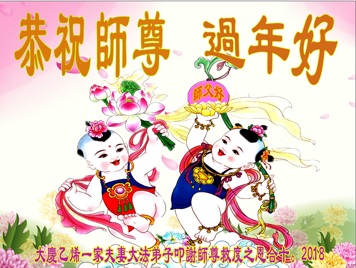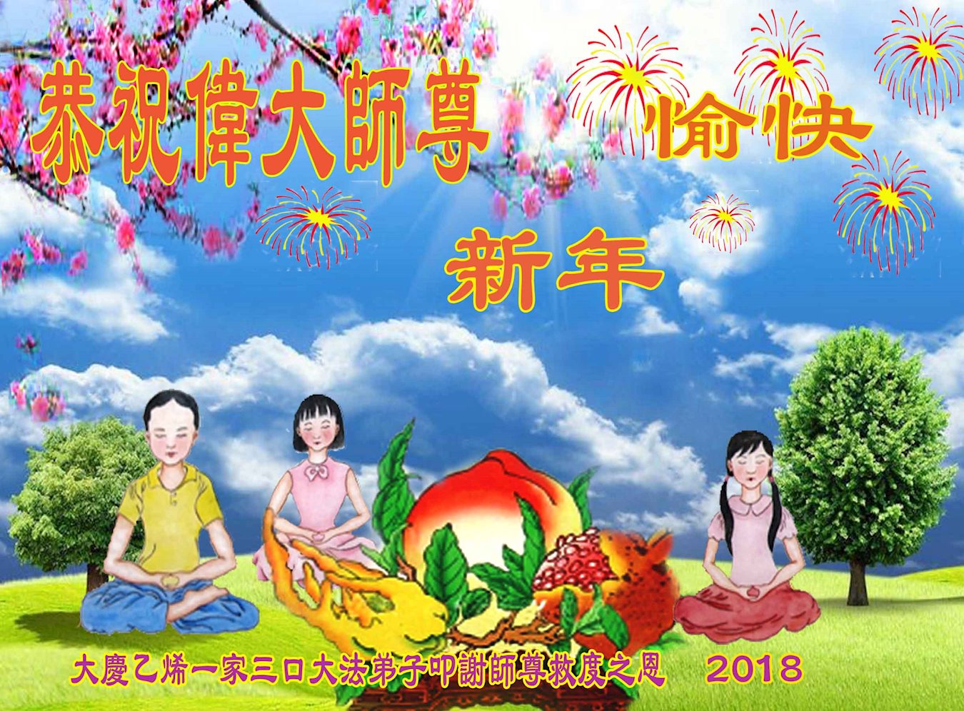 我代表母親、妹妹、妹夫給師父拜年!師尊過年好!在新的一年裏,我們要繼續做好三件事,修好自己,跟師父回家。謝謝師尊的慈悲救度!弟子全家敬拜!
