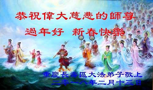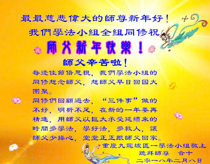 師父辛苦了,祝您新年快樂!弟子感謝您用巨大承受與付出給我們換來了還能繼續修煉的時間與機會,弟子在新的一年裏一定按照師尊講的:「高層次上的法一定要學透,知道怎麼樣去修煉」去做,實修好自己,平穩、努力的做好三件事,跟上正法進程,讓師父多一份欣慰,少一點操勞。