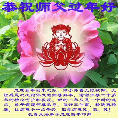 3、恭祝師父過年好!戊戌新年到來之際,弟子懷著無限敬仰、無限感恩之心給偉大的師尊拜年,謝謝師尊二十多年的精心呵護和救度。新的一年又是一個新的起點,弟子謹遵師尊教導,做好三件事,精進再精進,讓師尊少一點辛勞,但願師尊笑!長春大法弟子戊戌新年叩拜