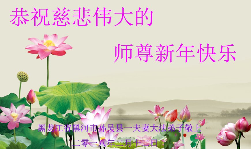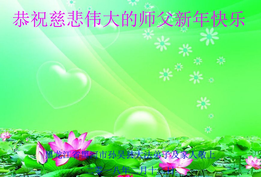 恭祝慈悲偉大的師父新年快樂!黑龍江省黑河市孫吳縣世人敬上!我們沒有修煉,可是知道法輪大法好,師父在救人,我們一家四口人,在新年來臨之際,給師父拜年,恭祝慈悲偉大的師父新年快樂!