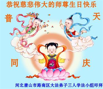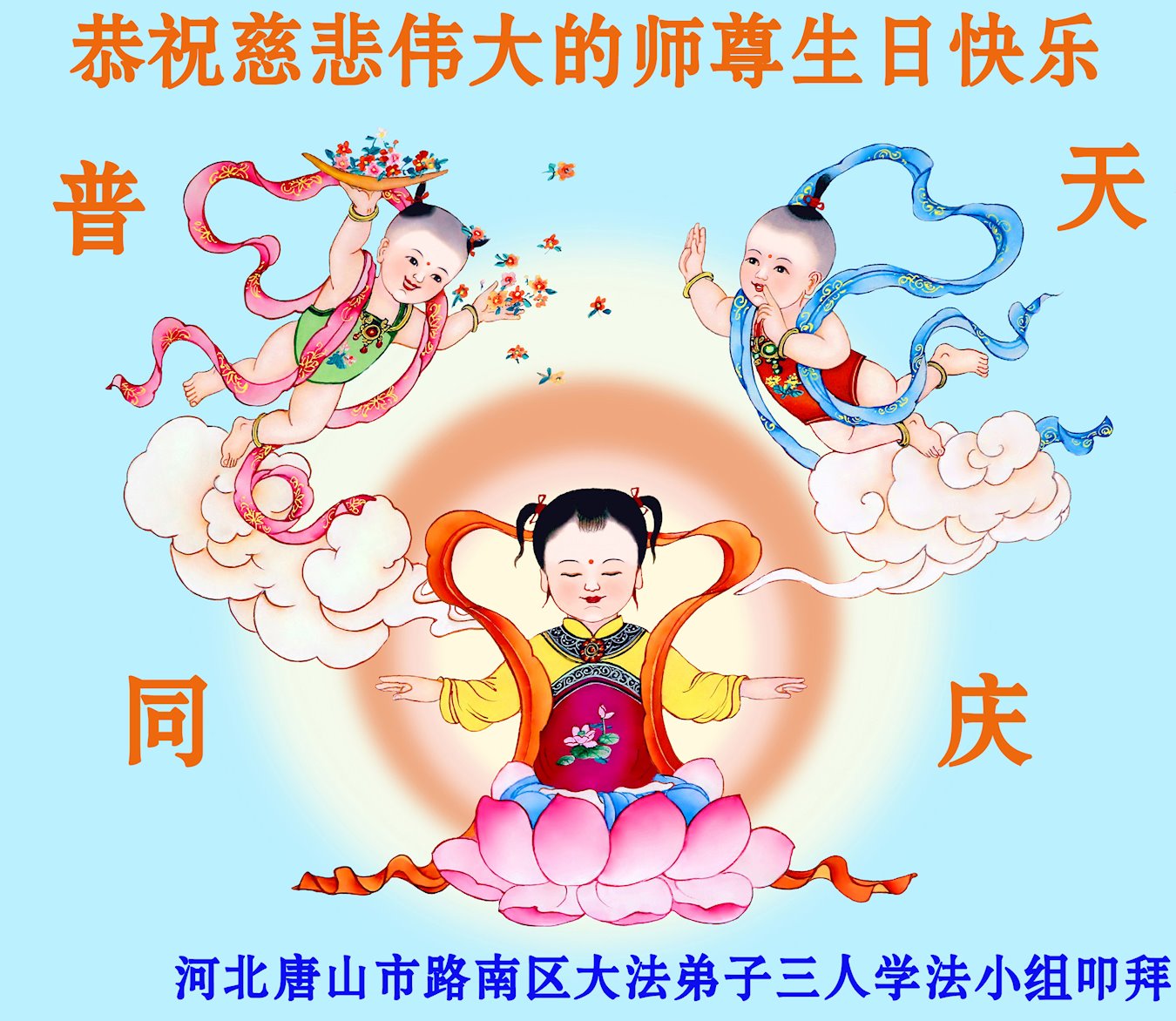 河北唐山市路南區大法弟子三人學法小組:恭祝師尊生日快樂!普天同慶!向內找,走出人,救眾生,圓滿歸。