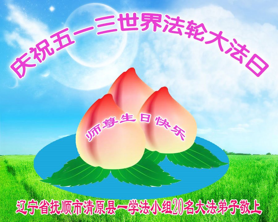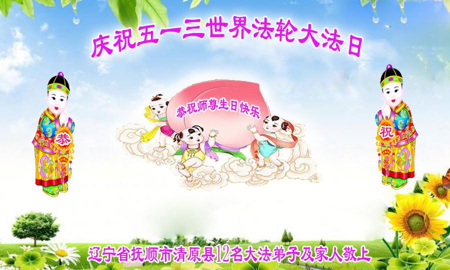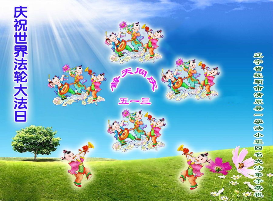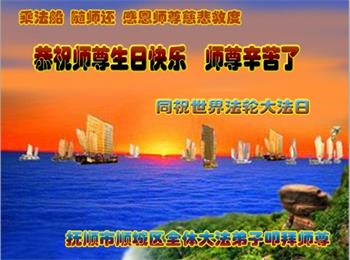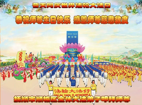 遼寧省撫順市順城區全體大法弟子恭祝慈悲偉大的師尊生日快樂!恭祝五一三世界法輪大法日!