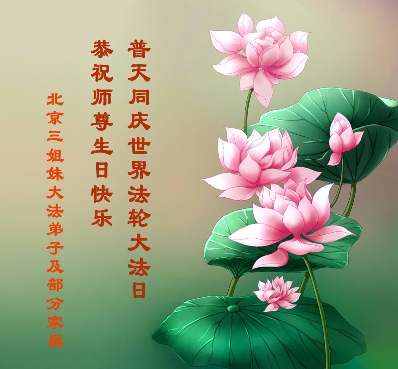 北京三姐妹大法弟子及部份家屬恭賀世界法輪大法日,並恭祝師尊生日快樂!