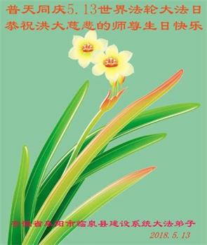 安徽省阜陽市臨泉縣建設系統大法弟子慶祝5.13世界法輪大法日!恭祝師尊生日快樂!