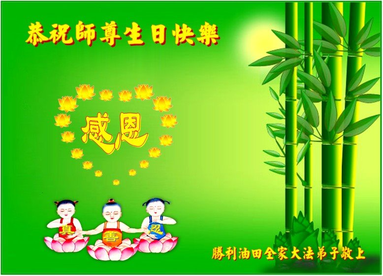 勝利油田全家大法弟子恭祝慈悲偉大的師尊生日快樂!恭賀法輪大法傳世二十六週年!