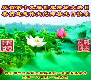四川省達州市開江縣原二輕局系統一老年大法弟子慶賀第十九屆世界法輪大法日!恭祝慈悲偉大的師尊生日快樂!