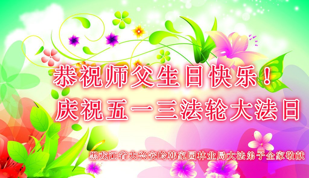 黑龍江省大興安嶺韓家園林業局大法弟子全家恭祝慈悲偉大的師尊生日快樂!慶祝世界法輪大法日!