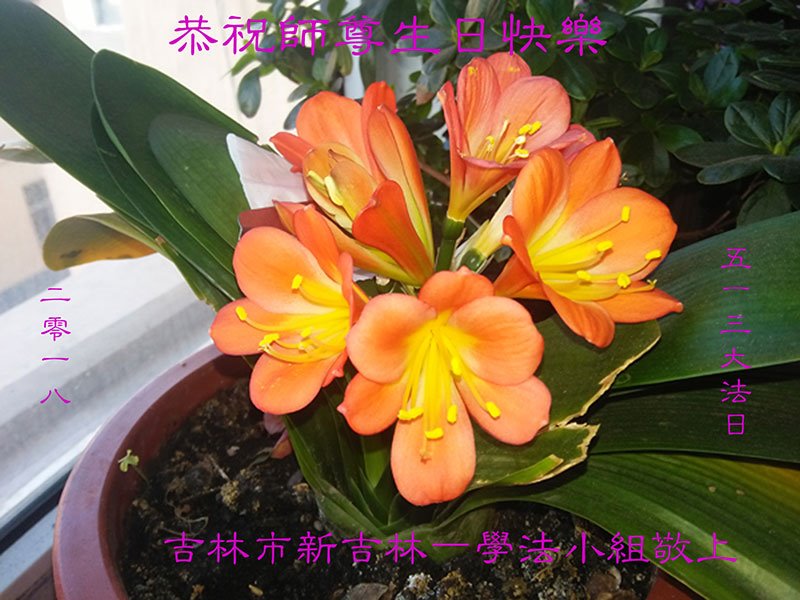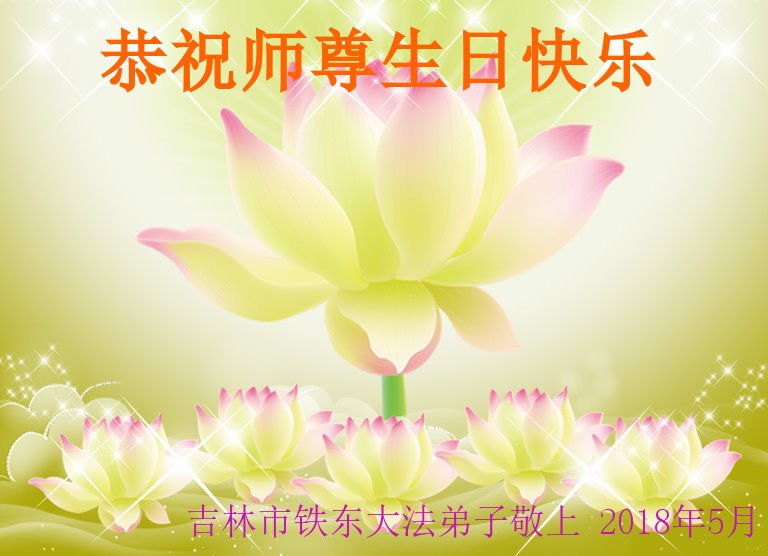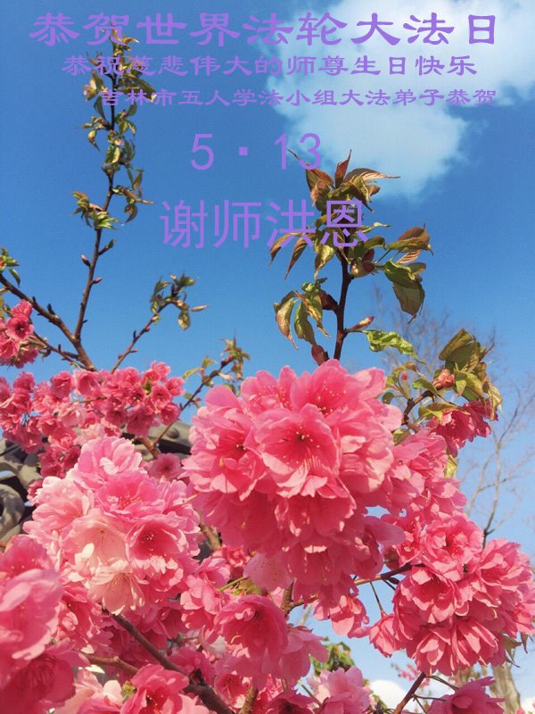 我們吉林市昌邑區某兩個學法小組全體大法弟子及家人衷心恭祝慈悲偉大的師父生日快樂!同時慶祝5﹒13世界法輪大法日!我們基本都是老弟子,在偉大師父的慈悲保護下走到了今天,如果沒有師父的慈悲呵護這是不可能的。在這二十多年的艱苦歷程中,時時刻刻都深深的感到了師恩浩蕩。在今後的每一天,我們都要牢記師父的教誨,做好三件事,多救人,完成歷史使命,跟師父回家。再一次恭賀偉大慈悲的師父生日快樂!雙手合十!跪拜!