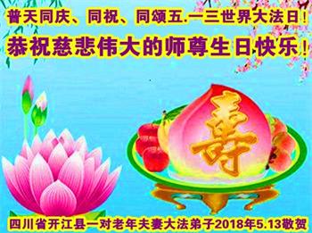 在這全世界普天同慶師父六十七華誕,暨5﹒13法輪大法日這個偉大的日子到來之際,我們老倆口大法弟子在此虔誠的恭祝我們偉大的師尊生日快樂!感恩師尊的慈悲救度,感恩師尊對生命的慈悲救度。