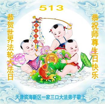天津濱海新區一家三口大法弟子恭賀世界法輪大法日!