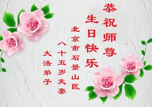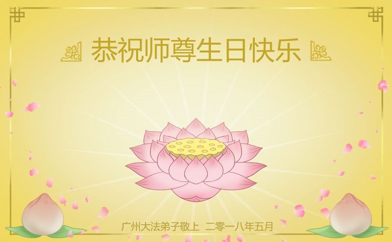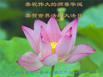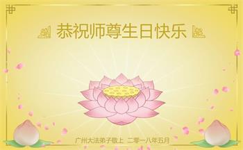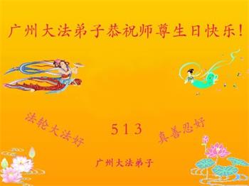 我們是廣州市番禺區三人學法小組,一人八十八歲,一人六十二歲,一人五十六歲。由於邪黨對大法的迫害,我們都經歷了風風雨雨,坎坎坷坷的魔難。但是我們堅修大法的決心越來越堅定!我們一定要牢記師父的教導,時時用真善忍歸正自己,修去人心,提高心性,做好三件事。不辜負師父的慈悲苦度,跟師父回家!在此叩拜師恩!恭祝師父生日快樂!恭賀法輪大法洪傳二十六週年!慶祝十九屆世界法輪大法日!