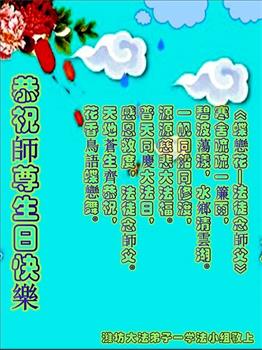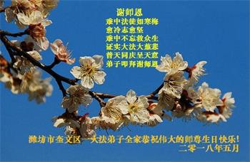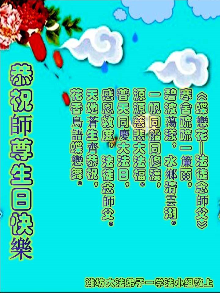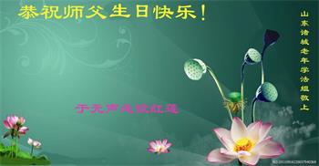 我們山東濰坊奎文區一學法小組,恭祝師尊生日快樂!恭賀世界法輪大法日!普天同慶!謝謝師父的苦度!弟子跪拜師父!