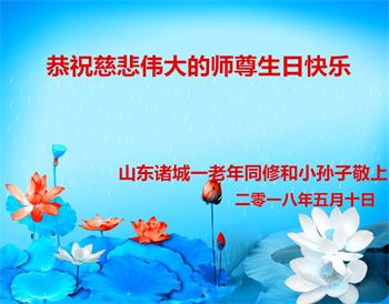 我是山東濰坊諸城一大法弟子,攜全家人恭祝師尊生日快樂!師父辛苦了!弟子決不辜負師尊的慈悲苦度,遵照師父教誨向內找,隨師圓滿把家還!