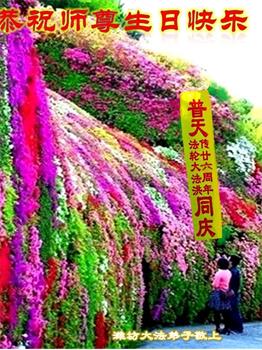 在世界法輪大法日!到來之際。我們恭祝慈悲、偉大的師父生日快樂!共慶法輪大法洪傳世界二十六年。聽師父話,比學比修,共同精進,緊跟師尊,堅修到底。