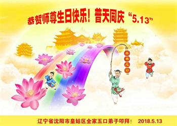 遼寧瀋陽皇姑區全家五口大法弟子恭祝偉大慈悲的師尊生日快樂!慶祝法輪大法日!