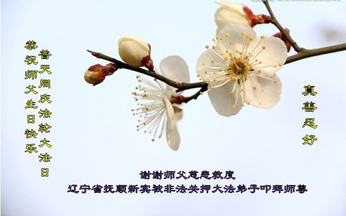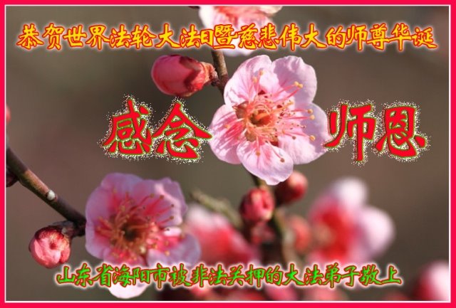 我身邊有一位同修,現在還在女子監獄遭受迫害,她從被抓到現在已經兩年多了,一直在絕食,非常堅定,去年被迫害的骨瘦如柴,又被迫害的骨折,一直不能行走。現在聽說,家人接見時,她在別人的攙扶下已經能出來接見了。當弟子們聽到這一消息時非常感動,再次升起對師尊的無限感恩,整個身心再次融到師尊的慈悲與洪恩浩蕩的幸福之中。雖然我們經歷了這場血雨腥風的巨難迫害,是師尊為弟子們的無數次的承受與付出,才使得弟子們堅定的走了過來,是慈悲偉大的師尊一次又一次的把弟子們從死忙邊緣救了回來。弟子們再次表達對師尊的無限感恩,弟子們跟隨師尊無怨無悔,我們胸懷坦蕩,我們一定會帶著得救的眾生走向未來、走向光明。願世人都來了解真相,同化大法,返本歸真,生命才會擁有真正的美好,才會得到真正的幸福。在此普天同慶世界法輪大法日之際,也代表被迫害的堅定的大法弟子恭祝慈悲偉大的師尊生日快樂!恭賀法輪大法洪傳世界26週年!