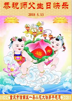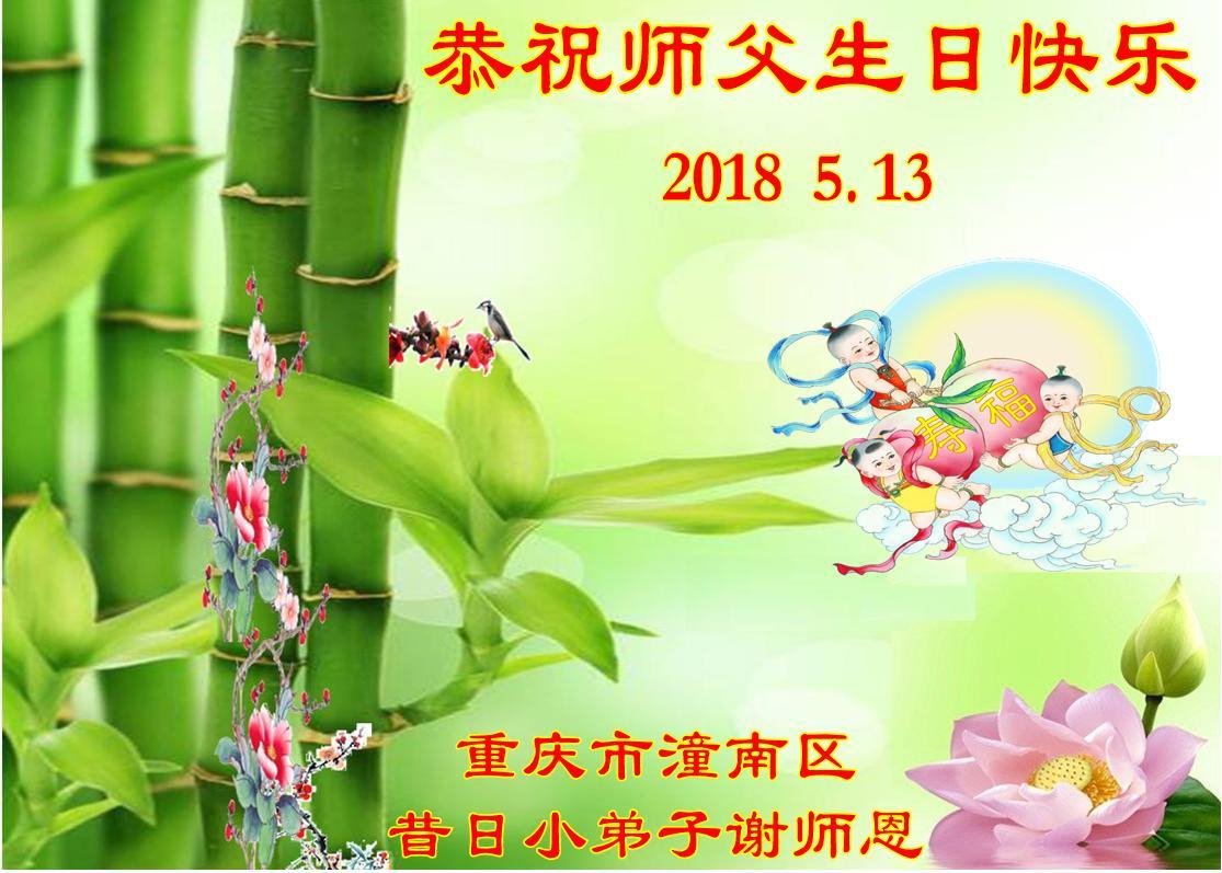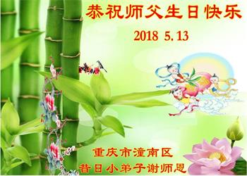 重慶市大足區大法弟子代全家人祝恩師生日快樂!我們一定銘記師父的諄諄教誨,做真修弟子,走正修煉的路,感恩師尊的慈悲苦度。