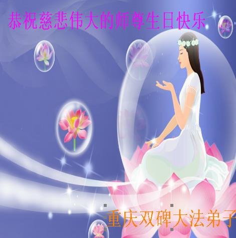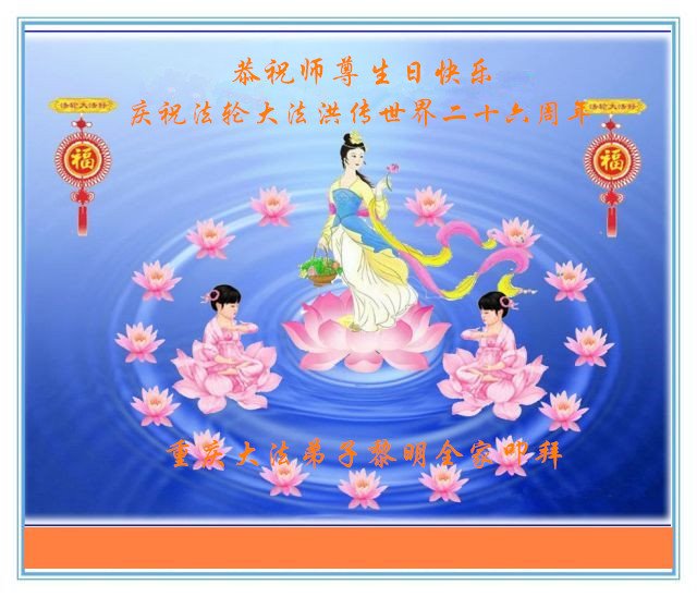 二十多年來,師父慈悲苦度,師父把我們一個個從地獄中撈起,一層層洗淨,使我們成為了令宇宙中眾神都羨慕的生命。大法弟子這一宇宙中第一神聖的稱號。而今又為我們重塑神體,我們何等萬幸!用盡人類所有的語言,也無法表達感激師父的洪恩。千言萬語彙成一句話:恭祝師父生日快樂!師父好!師父辛苦了!我們唯有在正法進程的尾聲中,精進再精進,多學法,學好法,多去執著心,多救人,兌現我們的史前大願,不辱使命,感恩師父洪恩浩蕩!