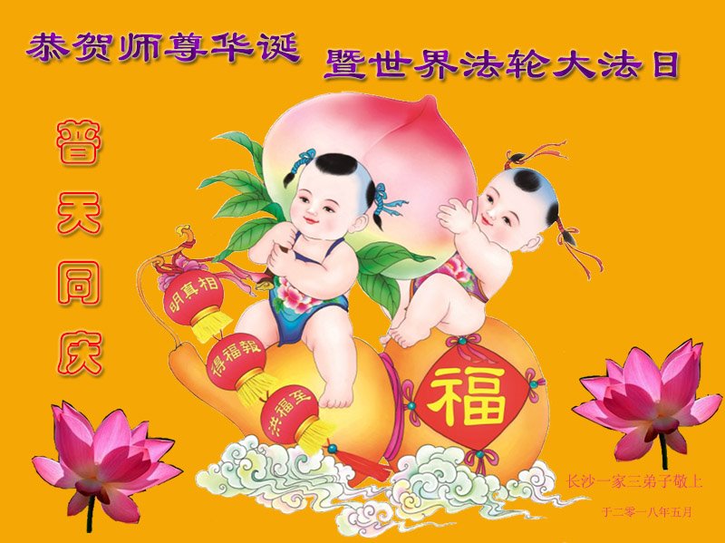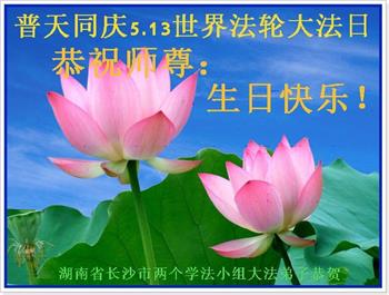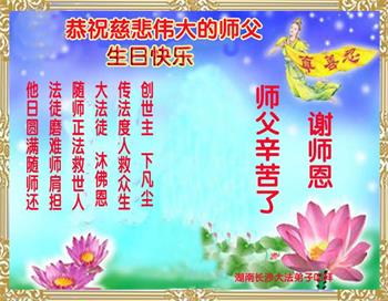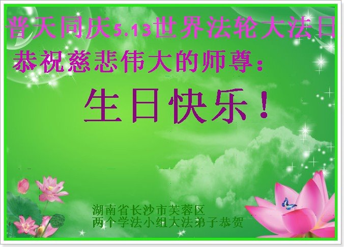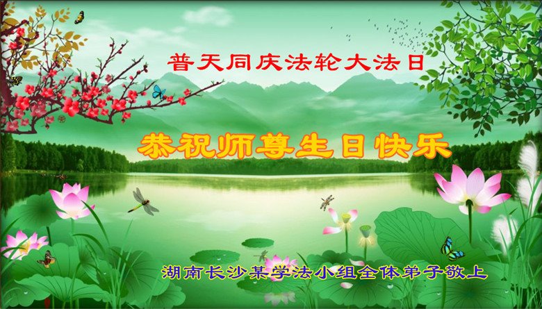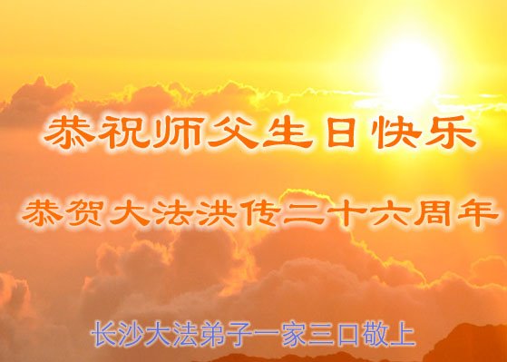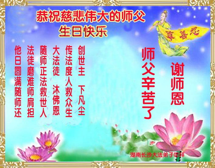 恭祝師尊華誕!同慶法輪大法日!長沙地區全體法輪大法弟子叩謝師尊苦度之恩!對師尊感恩之情無以言表,千言萬語彙成一句話:修好自己,多多救世人。希望能給師尊舔一點點欣慰。