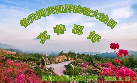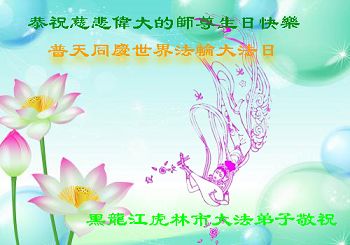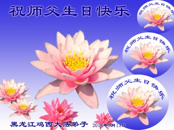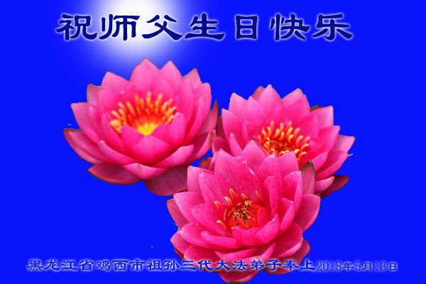 在這普天同慶「五一三」法輪大法日、師父聖誕來臨之際,遠隔重洋的中國大陸大法弟子想念師父,我們人在大陸,心早已飛向師父身邊。我們要與海外大法弟子同贊同頌偉大的師父!祝師父生日快樂!弟子要勇猛精進,圓滿隨師還!密山弟子無名合十跪拜!
