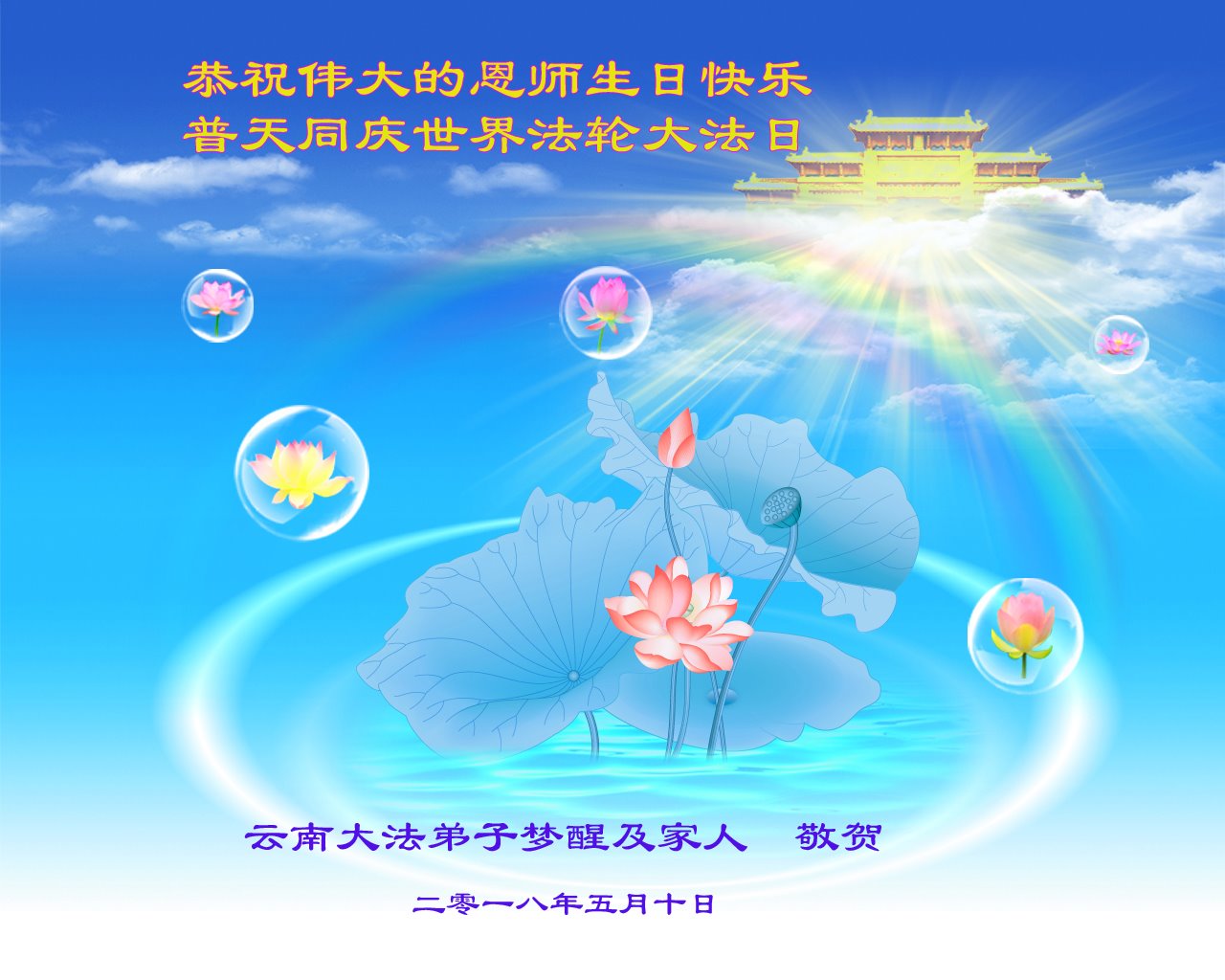 雲南大法弟子夢醒及家人恭祝師尊生日快樂!