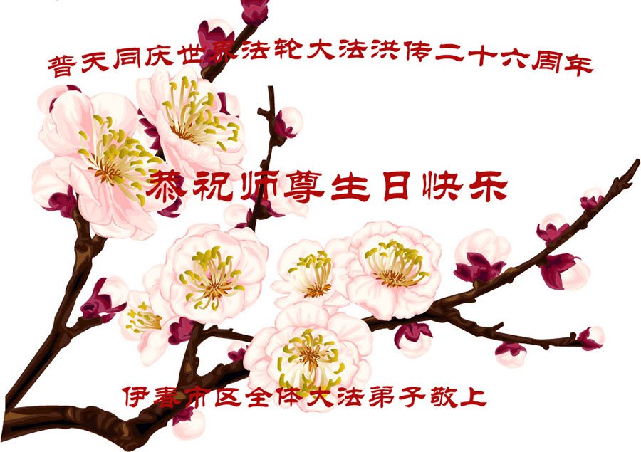在普天同慶的法輪大法洪傳二十六週年之際,我們全體大法弟子感恩師尊的慈悲苦度。在師尊正法最後階段,我們一定更加精進,彌補以往的損失,做好三件事救度一切有緣的眾生,走好最後證實大法之路跟師父回家。伊春市全體大法弟子叩拜師恩!