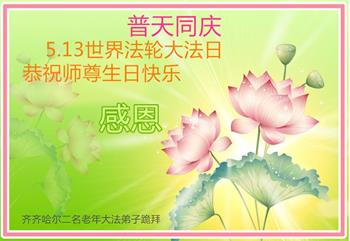 黑龍江省齊齊哈爾二名老年大法弟子恭祝師尊生日快樂!普天同慶世界法輪大法日!