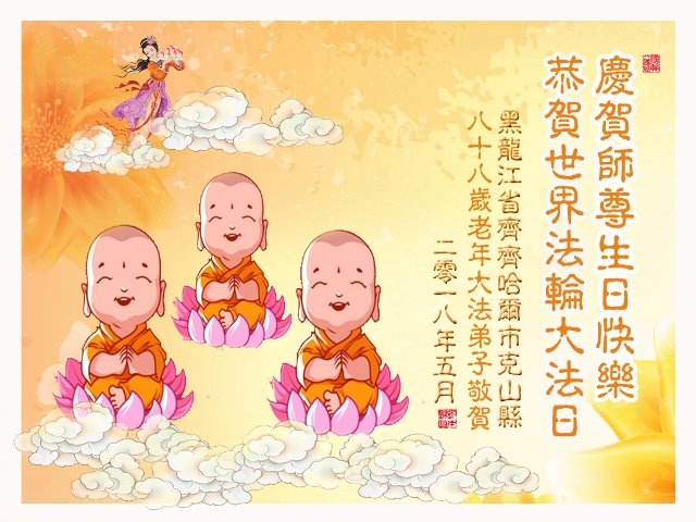 黑龍江江齊齊哈爾市克山八十八歲老年大法弟子敬賀師尊生日快樂!暨世界法輪大法日!