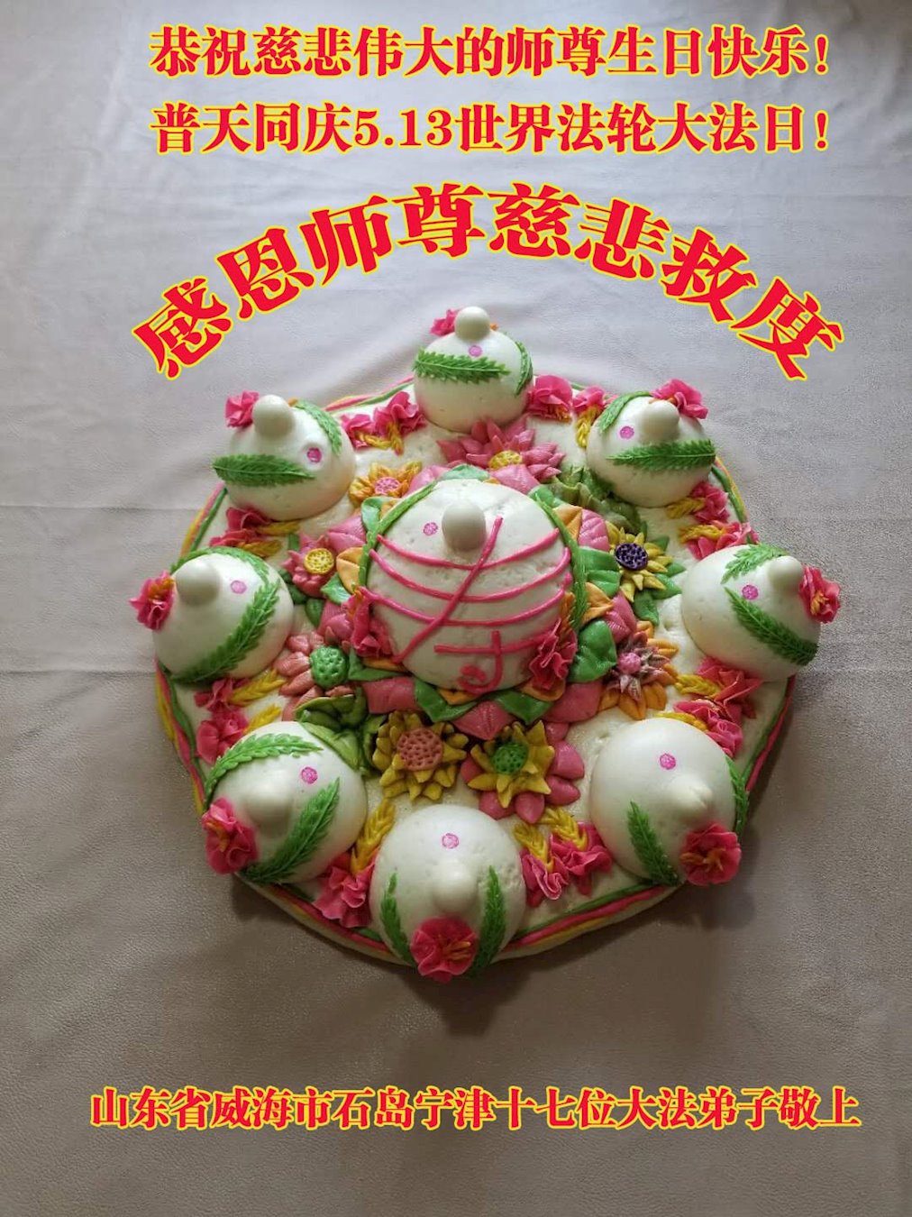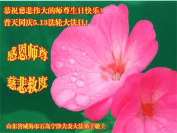 山東省威海市石島寧津夫妻大法弟子恭祝慈悲偉大的師尊生日快樂!普天同祝5.13世界法輪大法日!